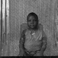 Women from Mbouda standing under a tree in front of a house, right hand on hip, raffia bag by her right foot. Format of original: 57mm x 59mm plastic negative
