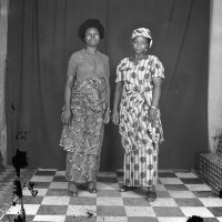 2 women from Bafounda, sitting, hands crossed, one in white top and "pagne" skirt, the other in headscarf. Format of original: 59mm x 59mm plastic negative