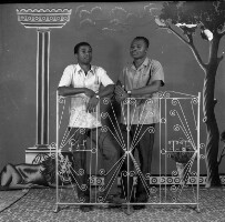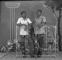 109. EAP054/1/155/107 Reference (shelfmark): EAP054/1/155/107 Title: Recreational photograph [c 1980] Scope & Content: 2 men standing behind iron grillwork Format of original: 58mm x 59mm plastic negative Collection Area: Endangered Archives Programme Languages: Not applicable Date Range: c 1980 Extent: 1 TIFF image