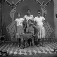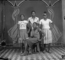 117. EAP054/1/155/138 Reference (shelfmark): EAP054/1/155/138 Title: Recreational photograph [c 1980] Scope & Content: Man standing between 2 women standing, one woman sitting in front Format of original: 55mm x 59mm plastic negative Collection Area: Endangered Archives Programme Languages: Not applicable Date Range: c 1980 Extent: 1 TIFF image