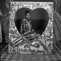 127. EAP054/1/81/303 Reference (shelfmark): EAP054/1/81/303 Title: Recreational photograph [c 1977] Scope & Content: Young woman sitting behind the [Bonne Annee] New Year cutout Format of original: 59mm x 59mm plastic negative Collection Area: Endangered Archives Programme Languages: Not applicable Date Range: c 1977 Extent: 1 TIFF image