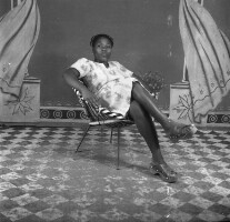 128. EAP054/1/81/307 Reference (shelfmark): EAP054/1/81/307 Title: Recreational photograph [c 1977] Scope & Content: Woman sitting in a black and white armchair. Format of original: 57mm x 59mm plastic negative Collection Area: Endangered Archives Programme Languages: Not applicable Date Range: c 1977 Extent: 1 TIFF image