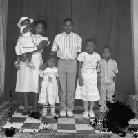 128. EAP054/1/105/69 Reference (shelfmark): EAP054/1/105/69 Title: Recreational photograph [c 1987] Scope & Content: Group of six people: woman, a man and four children; five people standing, woman holding baby in a hat with right thumb in mouth, a man's right hand on right shoulder of a girl. Format of original: 59mm x 59mm plastic negative Collection Area: Endangered Archives Programme Languages: Not applicable Date Range: c 1987 Extent: 1 TIFF image
