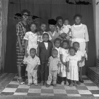 129. EAP054/1/105/71 Reference (shelfmark): EAP054/1/105/71 Title: Recreational photograph [c 1987] Scope & Content: Group of 14 people standing, one man holding a baby. Format of original: 59mm x 59mm plastic negative Collection Area: Endangered Archives Programme Languages: Not applicable Date Range: c 1987 Extent: 1 TIFF image