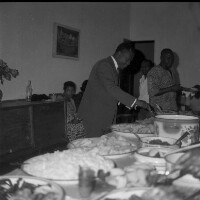153. EAP054/1/153/162 Reference (shelfmark): EAP054/1/153/162 Title: Recreational photograph [c 1976] Scope & Content: Table laden with food at a party, man serving himself Format of original: 59mm x 59mm plastic negative Collection Area: Endangered Archives Programme Languages: Not applicable Date Range: c 1976 Extent: 1 TIFF image
