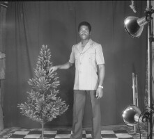 154. EAP054/1/163/282 Reference (shelfmark): EAP054/1/163/282 Title: Recreational photograph [c 1983] Scope & Content: Man standing touching a small plastic tree Format of original: 54mm x 59mm plastic negative Collection Area: Endangered Archives Programme Languages: Not applicable Date Range: c 1983 Extent: 1 TIFF image