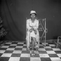160. EAP054/1/163/306 Reference (shelfmark): EAP054/1/163/306 Title: Recreational photograph [c 1983] Scope & Content: Woman sitting, hands on knees, legs crossed Format of original: 59mm x 59mm plastic negative Collection Area: Endangered Archives Programme Languages: Not applicable Date Range: c 1983 Extent: 1 TIFF image