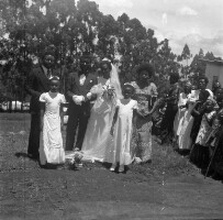 21. EAP054/1/81/176 Reference (shelfmark): EAP054/1/81/176 Title: Recreational photograph [c 1977] Scope & Content: Bridal couple after the wedding with bridesmaids and crowd Format of original: 59mm x 59mm plastic negative Collection Area: Endangered Archives Programme Languages: Not applicable Date Range: c 1977 Extent: 1 TIFF image