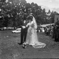 22. EAP054/1/81/177 Reference (shelfmark): EAP054/1/81/177 Title: Recreational photograph [c 1977] Scope & Content: Bridal couple after the wedding Format of original: 59mm x 59mm plastic negative Collection Area: Endangered Archives Programme Languages: Not applicable Date Range: c 1977 Extent: 1 TIFF image