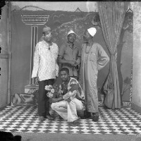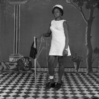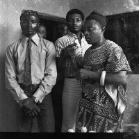 Wedding: bride and groom from Mbouda with their families in front of the Catholic Mission church in Mbouda, groom in dark jacket and bride in white dress. Format of original: 59mm x 59mm plastic negative