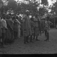 Four young people from Mbouda standing, 3 young women and a young man, he shaking hands with one of the young women. Mbouda chefferie behind. Format of original: 57mm x 59mm plastic negative