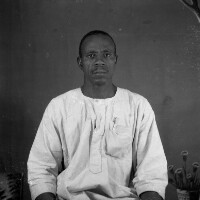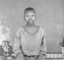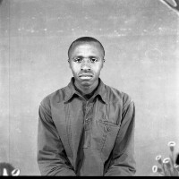 Young man from Bati standing, dark trousers and white shirt, white tennis shoes, right hand on iron grillwork, holding something white. Format of original: 59mm x 59mm plastic negative