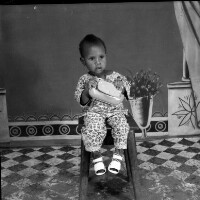 114. EAP054/1/132/114 Reference (shelfmark): EAP054/1/132/114 Title: Recreational photograph [c 1980] Scope & Content: Child sitting holding a purse Format of original: 59mm x 59mm plastic negative Collection Area: Endangered Archives Programme Languages: Not applicable Date Range: c 1980 Extent: 1 TIFF image