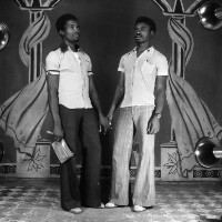504. EAP054/1/132/504 Reference (shelfmark): EAP054/1/132/504 Title: Recreational photograph [c 1980] Scope & Content: 2 young men holding hands, one with bag in right hand. Format of original: 59mm x 59mm plastic negative Collection Area: Endangered Archives Programme Languages: Not applicable Date Range: c 1980 Extent: 1 TIFF image