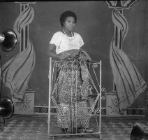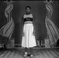544. EAP054/1/132/544 Reference (shelfmark): EAP054/1/132/544 Title: Recreational photograph [c 1980] Scope & Content: Woman from Babadjou standing, both hands on iron grillwork, in white top and "pagne" skirt, dark shoes. Format of original: 56mm x 59mm plastic negative Collection Area: Endangered Archives Programme Languages: Not applicable Date Range: c 1980 Extent: 1 TIFF image
