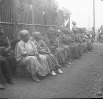 614. EAP054/1/132/614 Reference (shelfmark): EAP054/1/132/614 Title: Recreational photograph [c 1980] Scope & Content: Funeral in Babadjo, about 20 women sitting in a row by a fence. Format of original: 57mm x 59mm plastic negative Collection Area: Endangered Archives Programme Languages: Not applicable Date Range: c 1980 Extent: 1 TIFF image