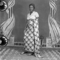 195. EAP054/1/134/195 Reference (shelfmark): EAP054/1/134/195 Title: Recreational photograph [c 1980] Scope & Content: Woman standing, "pagne" draped over her left arm. Format of original: 59mm x 59mm plastic negative Collection Area: Endangered Archives Programme Languages: Not applicable Date Range: c 1980 Extent: 1 TIFF image