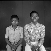 303. EAP054/1/134/303 Reference (shelfmark): EAP054/1/134/303 Title: Recreational photograph [c 1980] Scope & Content: Man in suit and a woman in flowered "pagne" outfit, both standing. Format of original: 59mm x 59mm plastic negative Collection Area: Endangered Archives Programme Languages: Not applicable Date Range: c 1980 Extent: 1 TIFF image