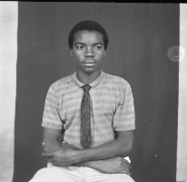 In front of the Boulangerie Patisserie Camerounaise (BPC) in Mbouda, Renault cars and motorbikes parked outside, a man sitting on a motorcycle in the middle of the road. Format of original: 59mm x 59mm plastic negative
