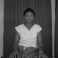 383. EAP054/1/140/383 Reference (shelfmark): EAP054/1/140/383 Title: Recreational photograph [c 1984] Scope & Content: Girl from Bameguyam standing, bag over right shoulder, dark dress, left hand on plastic tree. Format of original: 59mm x 59mm plastic negative Collection Area: Endangered Archives Programme Languages: Not applicable Date Range: c 1984 Extent: 1 TIFF image