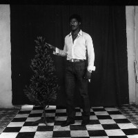 455. EAP054/1/140/455 Reference (shelfmark): EAP054/1/140/455 Title: Recreational photograph [c 1984] Scope & Content: Man standing in white shirt, right hand on plastic tree. Format of original: 59mm x 59mm plastic negative Collection Area: Endangered Archives Programme Languages: Not applicable Date Range: c 1984 Extent: 1 TIFF image