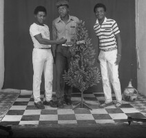 458. EAP054/1/140/458 Reference (shelfmark): EAP054/1/140/458 Title: Recreational photograph [c 1984] Scope & Content: 3 men standing, plastic tree in front. Format of original: 56mm x 59mm plastic negative Collection Area: Endangered Archives Programme Languages: Not applicable Date Range: c 1984 Extent: 1 TIFF image