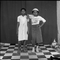 45. EAP054/1/140/45 Reference (shelfmark): EAP054/1/140/45 Title: Recreational photograph [c 1984] Scope & Content: 2 young women standing, one leaning with elbow on others shoulder Format of original: 59mm x 59mm plastic negative Collection Area: Endangered Archives Programme Languages: Not applicable Date Range: c 1984 Extent: 1 TIFF image