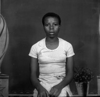 Woman standing, in matching pale top and skirt, handbag in right hand, next to decorated plastic tree. Format of original: 59mm x 59mm plastic negative