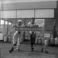 135. EAP054/1/156/135 Reference (shelfmark): EAP054/1/156/135 Title: Recreational photograph [c 1981] Scope & Content: 2 young men standing, leaning on a Michelin sign, in front of the canteen of the Mobil petrol station in Mbouda; fuel pump on left, fire extinguisher on wall on right. Format of original: 59mm x 59mm plastic negative Collection Area: Endangered Archives Programme Languages: Not applicable Date Range: c 1981 Extent: 1 TIFF image