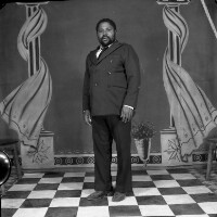 138. EAP054/1/156/138 Reference (shelfmark): EAP054/1/156/138 Title: Recreational photograph [c 1981] Scope & Content: Man from Mbouda standing, in dark suit and tie. Format of original: 59mm x 59mm plastic negative Collection Area: Endangered Archives Programme Languages: Not applicable Date Range: c 1981 Extent: 1 TIFF image