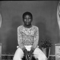 348. EAP054/1/156/348 Reference (shelfmark): EAP054/1/156/348 Title: Recreational photograph [c 1981] Scope & Content: Woman from Bangang sitting, legs crossed, in "pagne" outfit, hands on knees. Format of original: 59mm x 59mm plastic negative Collection Area: Endangered Archives Programme Languages: Not applicable Date Range: c 1981 Extent: 1 TIFF image