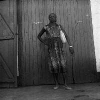 99. EAP054/1/158/99 Reference (shelfmark): EAP054/1/158/99 Title: Recreational photograph [c 1980] Scope & Content: Woman from Bati, right hand on hip in front of plank doorway Format of original: 59mm x 59mm plastic negative Collection Area: Endangered Archives Programme Languages: Not applicable Date Range: c 1980 Extent: 1 TIFF image