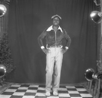 421. EAP054/1/163/421 Reference (shelfmark): EAP054/1/163/421 Title: Recreational photograph [c 1983] Scope & Content: Man standing hands on hips Format of original: 57mm x 59mm plastic negative Collection Area: Endangered Archives Programme Languages: Not applicable Date Range: c 1983 Extent: 1 TIFF image