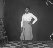 451. EAP054/1/163/451 Reference (shelfmark): EAP054/1/163/451 Title: Recreational photograph [c 1983] Scope & Content: Woman standing hand on hip, handbag on ground Format of original: 59mm x 59mm plastic negative Collection Area: Endangered Archives Programme Languages: Not applicable Date Range: c 1983 Extent: 1 TIFF image
