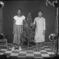 473. EAP054/1/163/473 Reference (shelfmark): EAP054/1/163/473 Title: Recreational photograph [c 1983] Scope & Content: 2 young women standing either side of a plastic tree both touching it Format of original: 59mm x 59mm plastic negative Collection Area: Endangered Archives Programme Languages: Not applicable Date Range: c 1983 Extent: 1 TIFF image