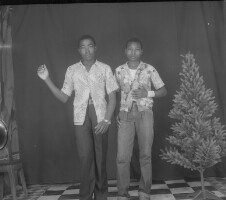 116. EAP054/1/164/116 Reference (shelfmark): EAP054/1/164/116 Title: Recreational photograph [c 1982] Scope & Content: 2 young men standing, one with raised hand by plastic tree Format of original: 52mm x 59mm plastic negative Collection Area: Endangered Archives Programme Languages: Not applicable Date Range: c 1982 Extent: 1 TIFF image