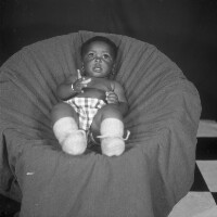 159. EAP054/1/164/159 Reference (shelfmark): EAP054/1/164/159 Title: Recreational photograph [c 1982] Scope & Content: Baby in an armchair Format of original: 59mm x 59mm plastic negative Collection Area: Endangered Archives Programme Languages: Not applicable Date Range: c 1982 Extent: 1 TIFF image