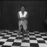 187. EAP054/1/164/187 Reference (shelfmark): EAP054/1/164/187 Title: Recreational photograph [c 1982] Scope & Content: Woman sitting, legs crossed, hands on knees Format of original: 59mm x 59mm plastic negative Collection Area: Endangered Archives Programme Languages: Not applicable Date Range: c 1982 Extent: 1 TIFF image