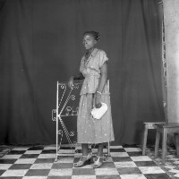 227. EAP054/1/164/227 Reference (shelfmark): EAP054/1/164/227 Title: Recreational photograph [c 1982] Scope & Content: Girl, hands on hips, handbag hanging from neck by plastic tree Format of original: 59mm x 59mm plastic negative Collection Area: Endangered Archives Programme Languages: Not applicable Date Range: c 1982 Extent: 1 TIFF image