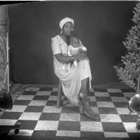 140. EAP054/1/167/140 Reference (shelfmark): EAP054/1/167/140 Title: Recreational photograph [c 1983] Scope & Content: Woman from Bamedjo sitting, legs crossed, baby on lap, in white, headscarf. Format of original: 59mm x 59mm plastic negative Collection Area: Endangered Archives Programme Languages: Not applicable Date Range: c 1983 Extent: 1 TIFF image