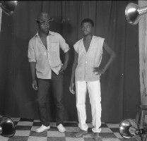 104. EAP054/1/170/104 Reference (shelfmark): EAP054/1/170/104 Title: Recreational photograph [c 1985] Scope & Content: Standing, 2 young men with hands on hips Format of original: 57mm x 59mm plastic negative Collection Area: Endangered Archives Programme Languages: Not applicable Date Range: c 1985 Extent: 1 TIFF image