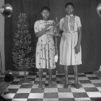 105. EAP054/1/170/105 Reference (shelfmark): EAP054/1/170/105 Title: Recreational photograph [c 1985] Scope & Content: 2 young women standing by a plastic tree, one holding a fir twig (from plastic tree) Format of original: 59mm x 59mm plastic negative Collection Area: Endangered Archives Programme Languages: Not applicable Date Range: c 1985 Extent: 1 TIFF image