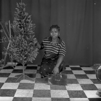 207. EAP054/1/170/207 Reference (shelfmark): EAP054/1/170/207 Title: Recreational photograph [c 1985] Scope & Content: Young woman crouching by a plastic tree Format of original: 59mm x 59mm plastic negative Collection Area: Endangered Archives Programme Languages: Not applicable Date Range: c 1985 Extent: 1 TIFF image