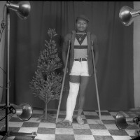 318. EAP054/1/170/318 Reference (shelfmark): EAP054/1/170/318 Title: Recreational photograph [c 1985] Scope & Content: Man standing on crutches with a leg in plaster by plastic tree Format of original: 59mm x 59mm plastic negative Collection Area: Endangered Archives Programme Languages: Not applicable Date Range: c 1985 Extent: 1 TIFF image