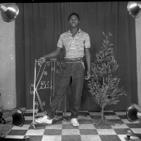 416. EAP054/1/170/416 Reference (shelfmark): EAP054/1/170/416 Title: Recreational photograph [c 1985] Scope & Content: Man standing by a plastic tree Format of original: 59mm x 59mm plastic negative Collection Area: Endangered Archives Programme Languages: Not applicable Date Range: c 1985 Extent: 1 TIFF image