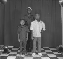 487. EAP054/1/170/487 Reference (shelfmark): EAP054/1/170/487 Title: Recreational photograph [c 1985] Scope & Content: Man standing with 2 male children in front Format of original: 56mm x 59mm plastic negative Collection Area: Endangered Archives Programme Languages: Not applicable Date Range: c 1985 Extent: 1 TIFF image