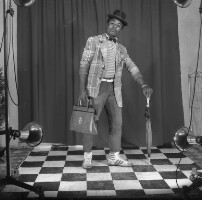 64. EAP054/1/170/64 Reference (shelfmark): EAP054/1/170/64 Title: Recreational photograph [c 1985] Scope & Content: Man from Mbouda standing and with umbrella and briefcase. Charlie Chaplin-like pose Format of original: 59mm x 59mm plastic negative Collection Area: Endangered Archives Programme Languages: Not applicable Date Range: c 1985 Extent: 1 TIFF image