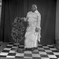 321. EAP054/1/171/321 Reference (shelfmark): EAP054/1/171/321 Title: Recreational photograph [c 1986] Scope & Content: Woman standing touching a plastic tree Format of original: 59mm x 59mm plastic negative Collection Area: Endangered Archives Programme Languages: Not applicable Date Range: c 1986 Extent: 1 TIFF image