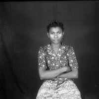 158. EAP054/1/173/158 Reference (shelfmark): EAP054/1/173/158 Title: Recreational photograph [c 1989] Scope & Content: Woman standing holding drink can, between painted gourd and tree Format of original: 59mm x 59mm plastic negative Collection Area: Endangered Archives Programme Languages: Not applicable Date Range: c 1989 Extent: 1 TIFF image