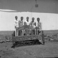 647. EAP054/1/30/647 Reference (shelfmark): EAP054/1/30/647 Title: Recreational photograph [c 1981] Scope & Content: 5 men standing with carved bedhead Format of original: 59mm x 59mm plastic negative Collection Area: Endangered Archives Programme Languages: Not applicable Date Range: c 1981 Extent: 1 TIFF image